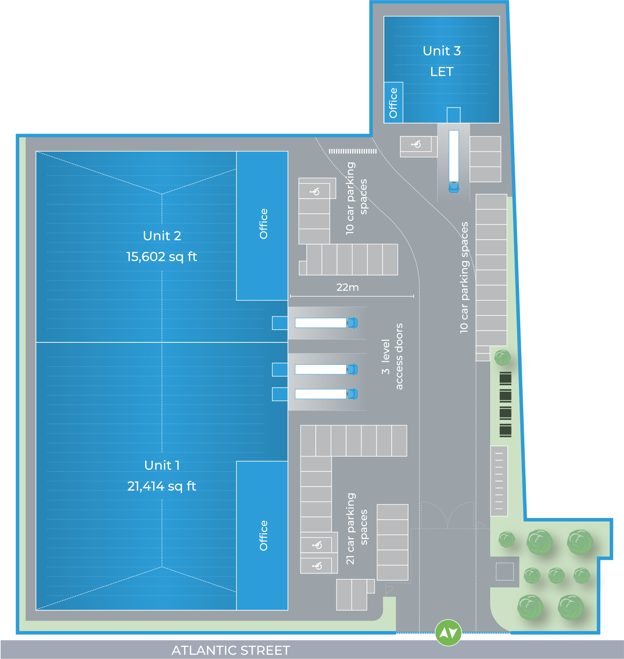 Unit 1 – 21,414 sq ft | Unit 2 – 15,602 sq ft | Unit 3 – Let
